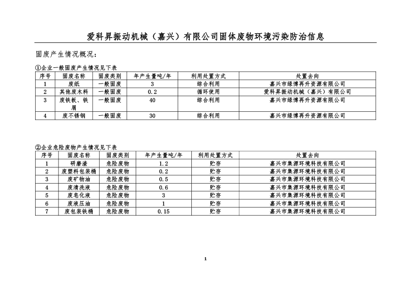 爱科昇振动机械(嘉兴)有限公司固体废物环境污染防治信息