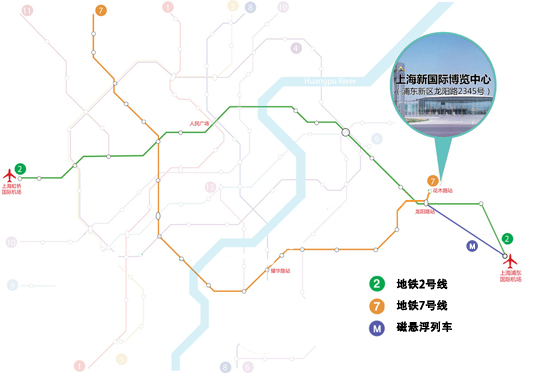 轨道交通3、4号线中山公园站、1、8号线人民广场站、4、6号线世纪大道站皆可换乘轨道交通2号线(往浦东国际机场站方向)至龙阳路站下车后出站步行至展馆。或可继续换乘轨道交通7号线至花木路站直达展馆。