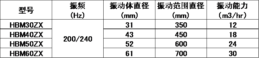 由此可见,凝土振动产品的振捣压实能率在很大程度上是受振动特性和混凝土特性的影响的。在理解以上内容的基础上请参考以下“高频混凝土振动棒振动压实能力表”。以下参数为混凝土塌落度8cm,振捣位置不重复等条件下的实测值。仅供参考。