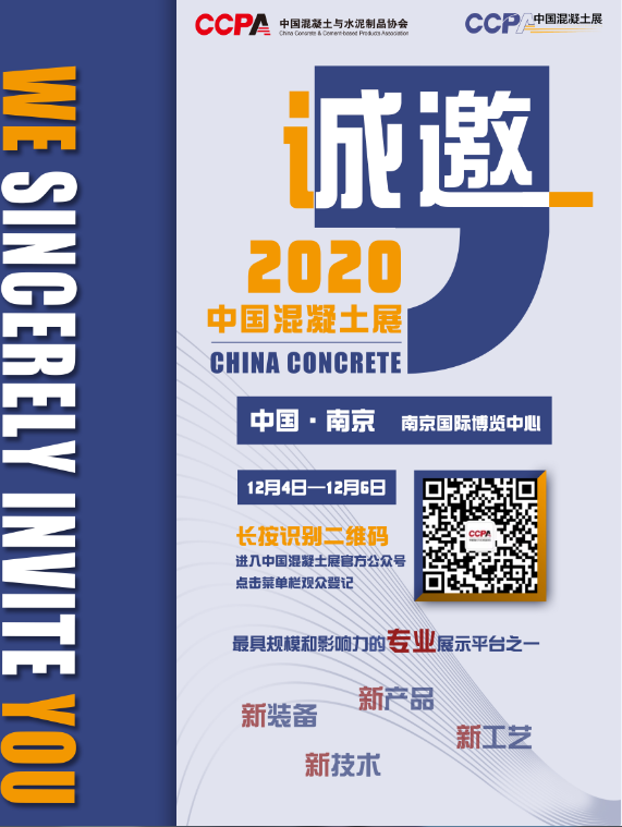 2020年12月4日至6日,由中国混凝土与水泥制品协会主办的2020中国混凝土展将在南京隆重举行。这是新冠疫情突袭中国并被中国政府与人民科学防控后,全球混凝土与水泥制品行业规模最大、汇集产品门类最全、将吸引到会人数最多的混凝土与水泥制品及产业链新产品、新技术、新装备、新成果的展示窗口,同时,也是检阅与回顾“十三五”期间中国混凝土与水泥制品进步的盛大平台。展会将与2020中国混凝土行业大会并行举行,共同聚焦混凝土与水泥制品产业的信息交流、产业融合与行业发展。